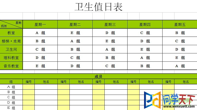 卫生值日表包括公司卫生值日、办公室卫生值日表、班级卫生值日表模板等,为营造良好的办公和学习环境,卫生清洁必不可少,合理的安排人员打造卫生,提供整体的幸福度!